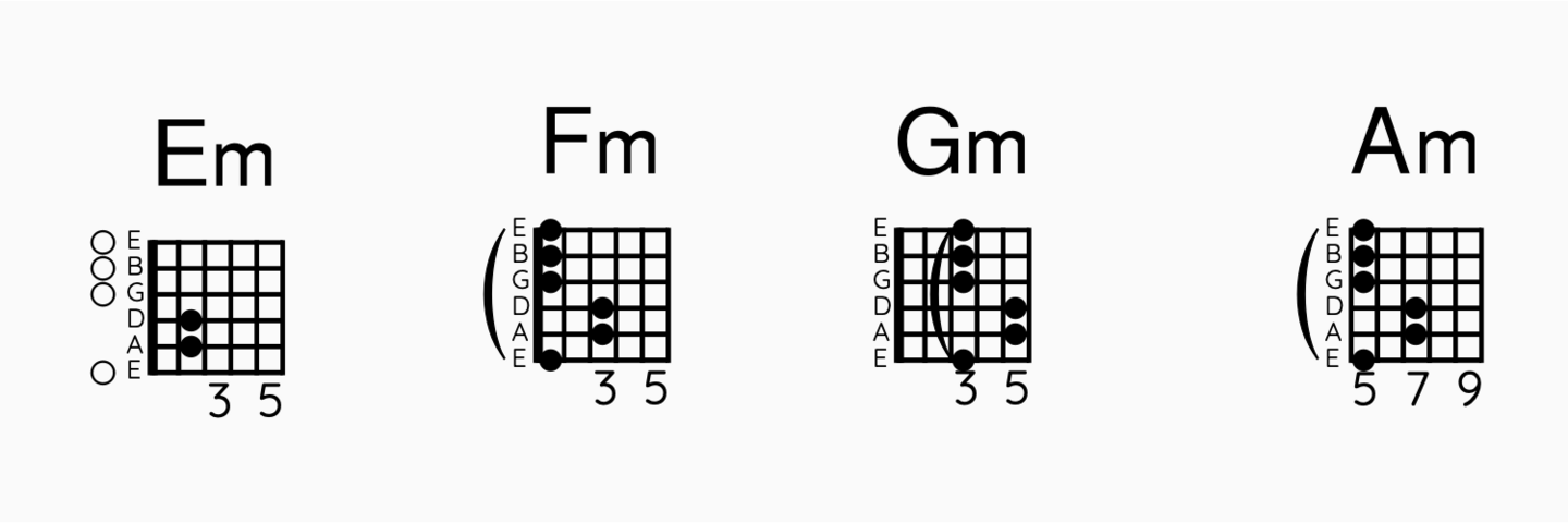 別の言い方をすると開放弦が人差し指だとイメージすると、Emはハイコードと同じ形なんです。