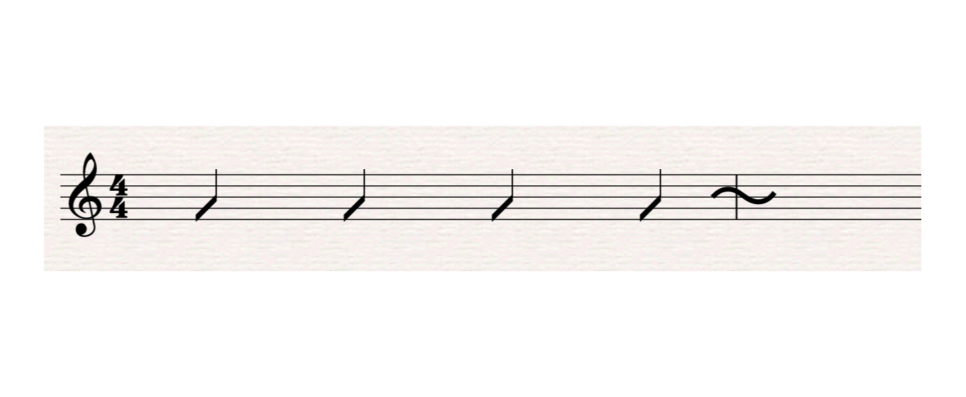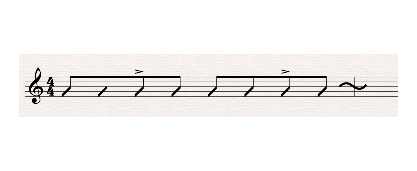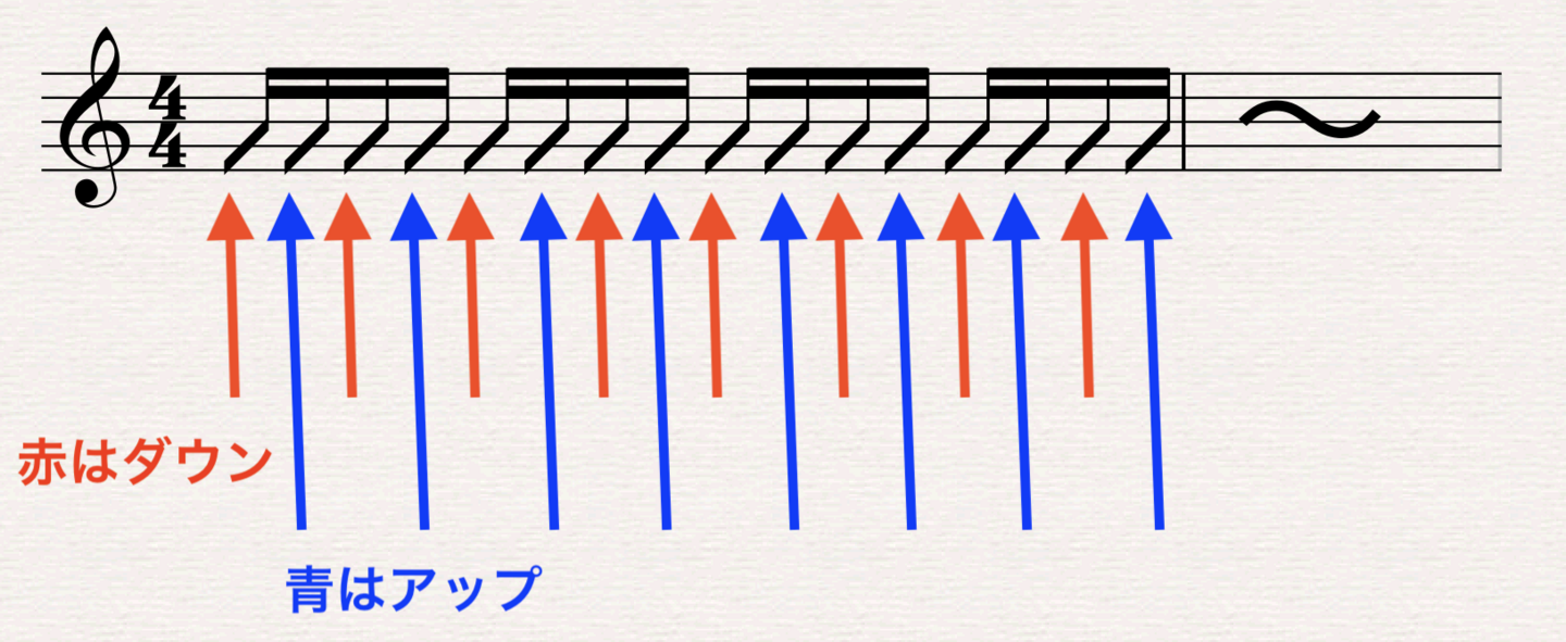 次に8分音符、さらに16分音符(アップ、ダウン使用)で。