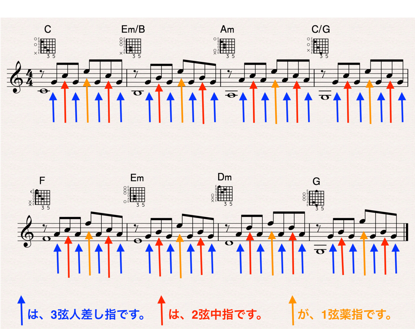 今回は薬指を使って1弦を弾きますので、今回の形がアルペジオの基本形と言えるでしょう。