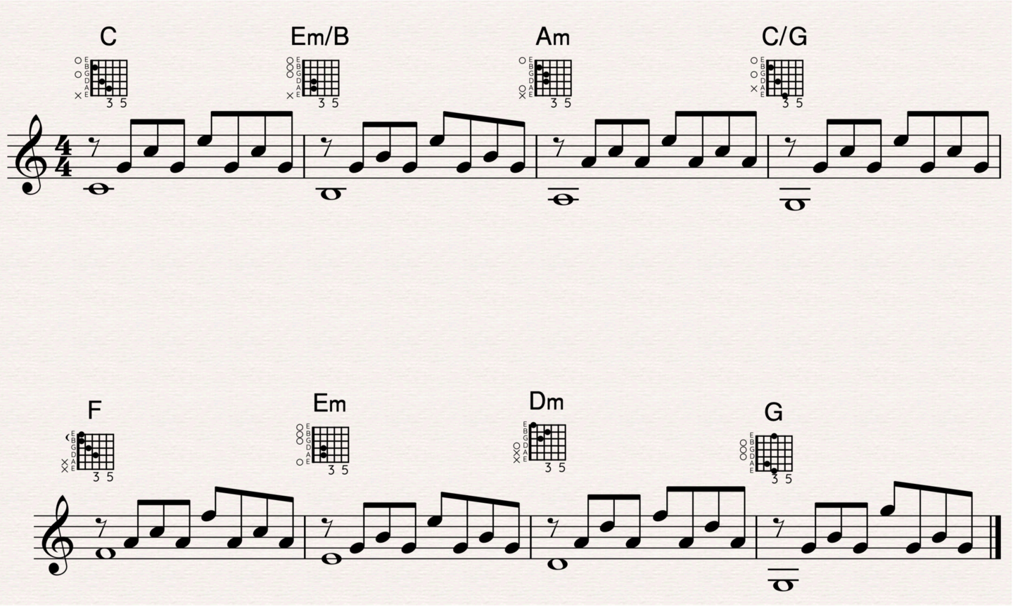 今回も前回までのコード進行でアルペジオのパターンを紹介します。