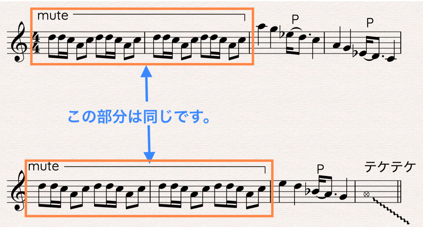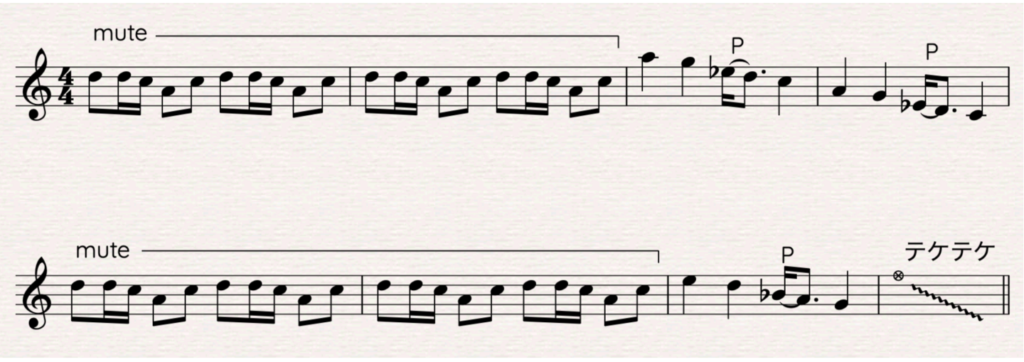 実際の現場では、楽譜にこのようにテケテケと書かれることが多いです。