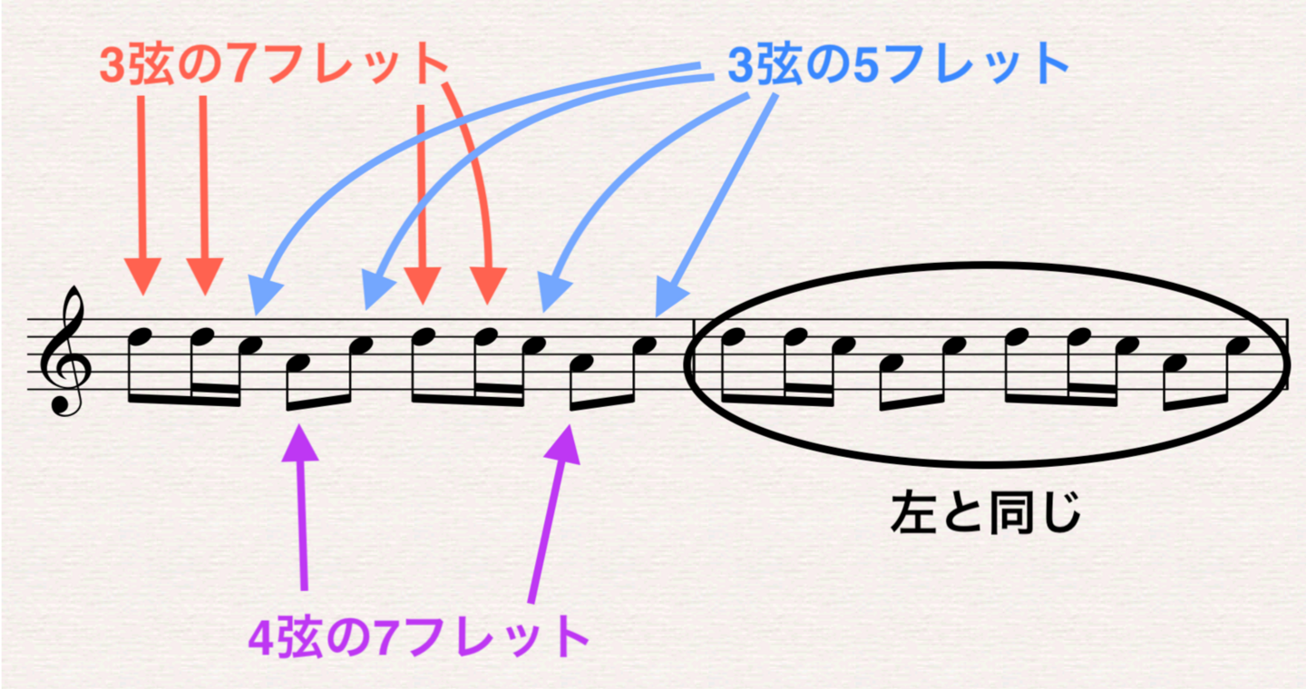 次は4弦の7フレット(ラ)に薬指を、人差し指を5フレット(ソ)に。