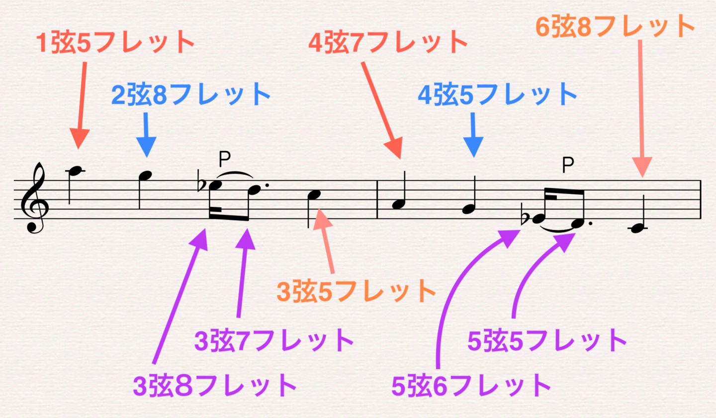 4弦の8フレット(シ♭)が小指です。