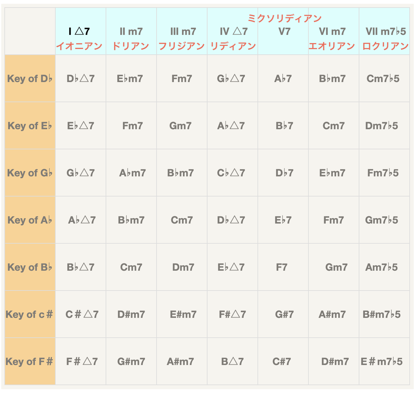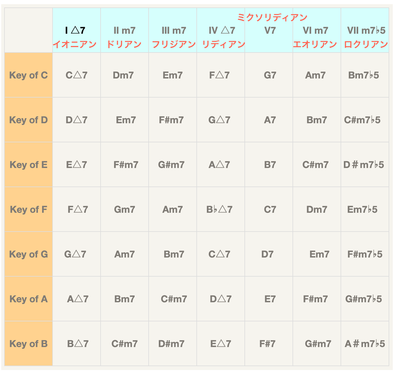 006コード進行でチラッと説明した Ⅰ-Ⅵ-Ⅳ-Ⅴ のようなアラビア数字それぞれにスケールというものがあります。