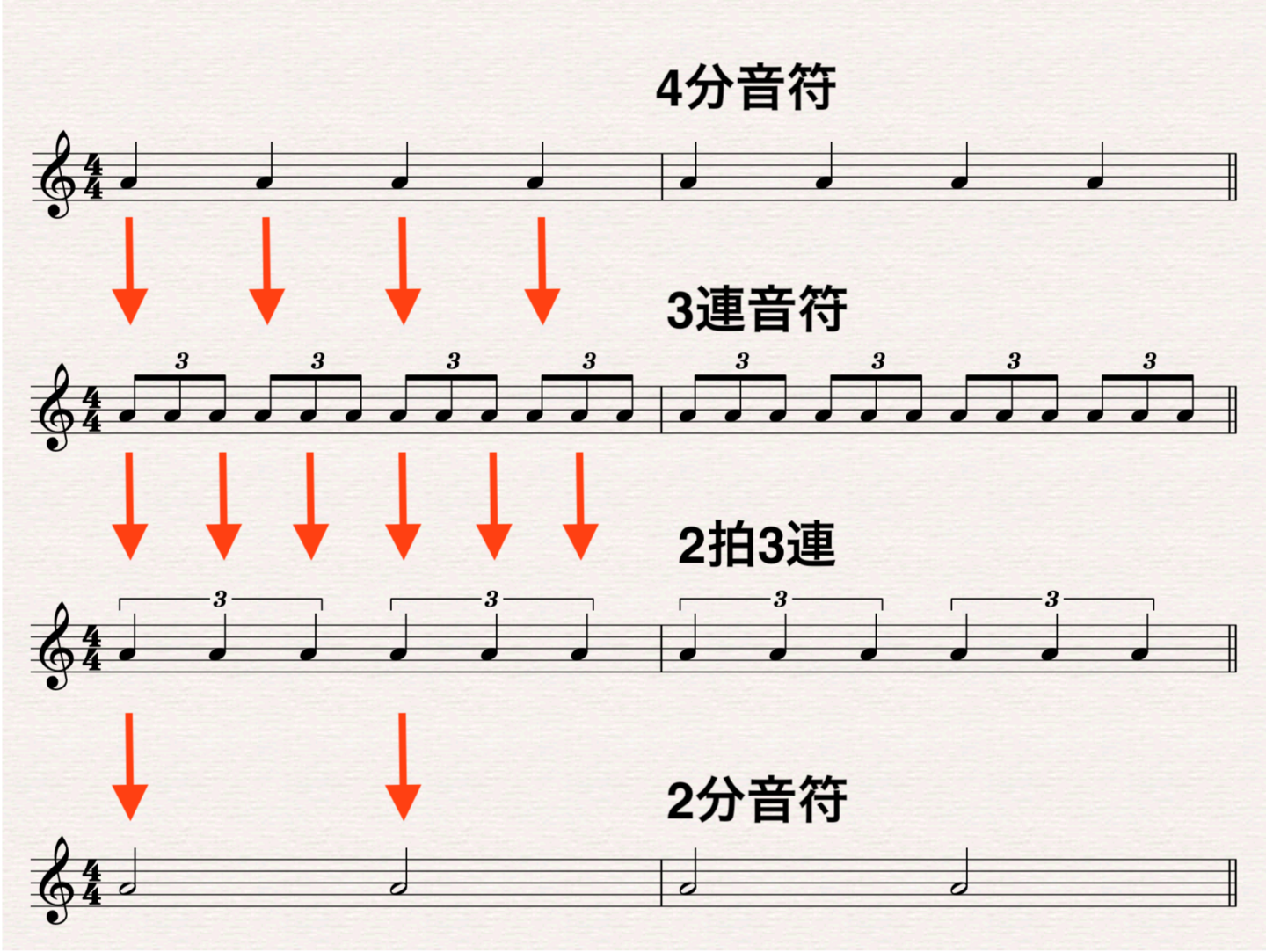 4分音符、8分音符、16分音符、2分音符、全音符、3連符、2博3連、についてです。 ギターを演奏しながらですので、